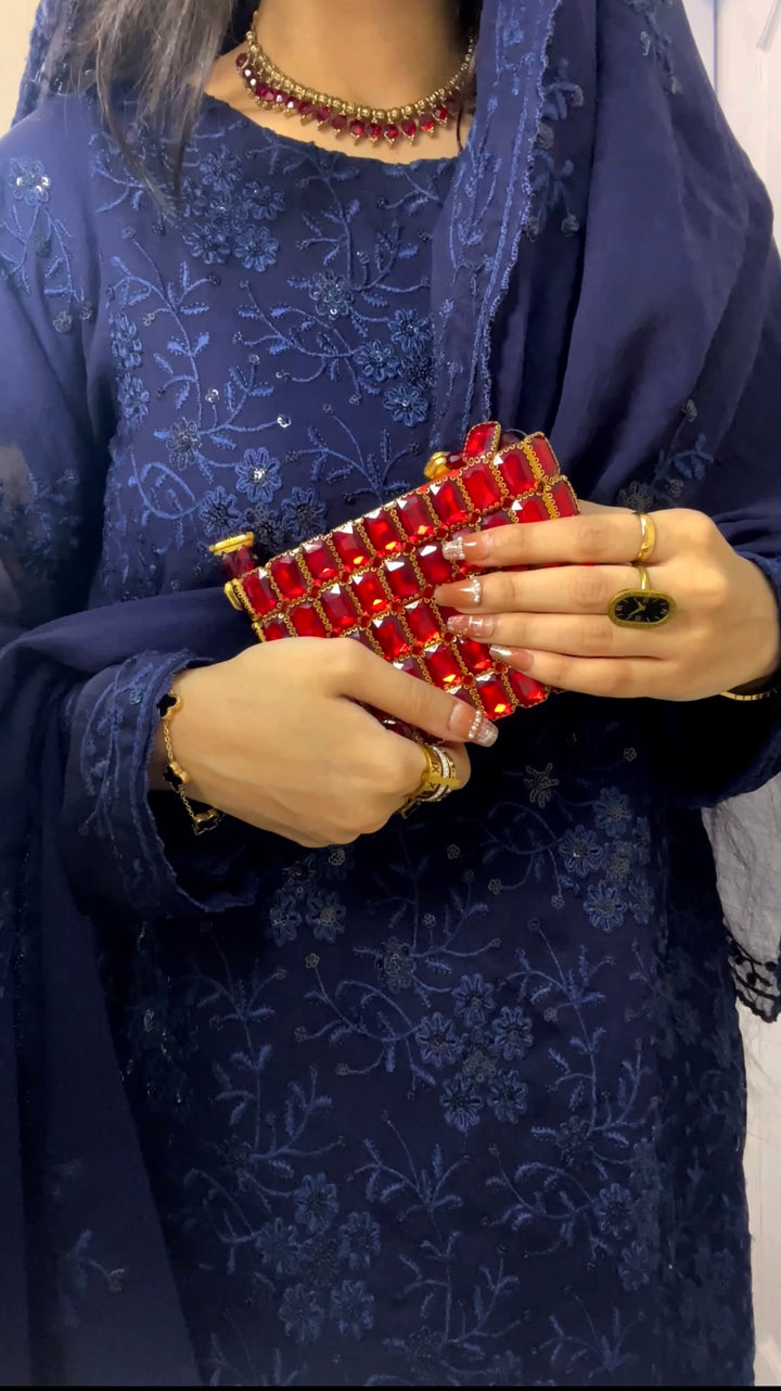 Add a radiant touch to your evening or bridal ensemble with our Red Gemstone Clutch, meticulously adorned with vibrant emerald-green glass stones framed in golden detail. This dazzling accessory is designed to catch and reflect light from every angle, creating a breathtaking sparkle that enhances any outfit with sophistication and charm.